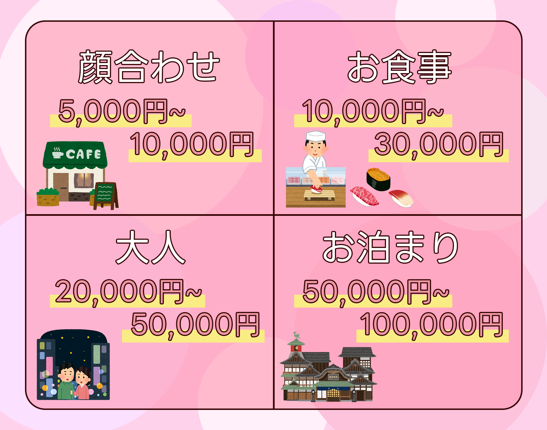 顔合わせやお茶だけのデートは、交通費込みで5,000円〜10,000円が相場です。
